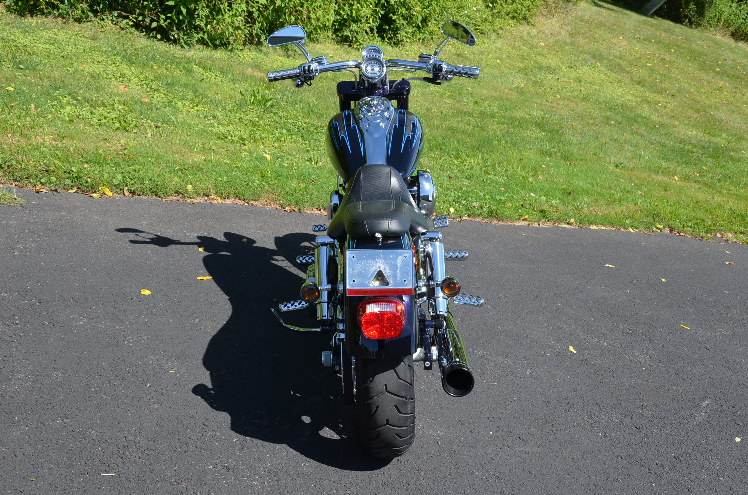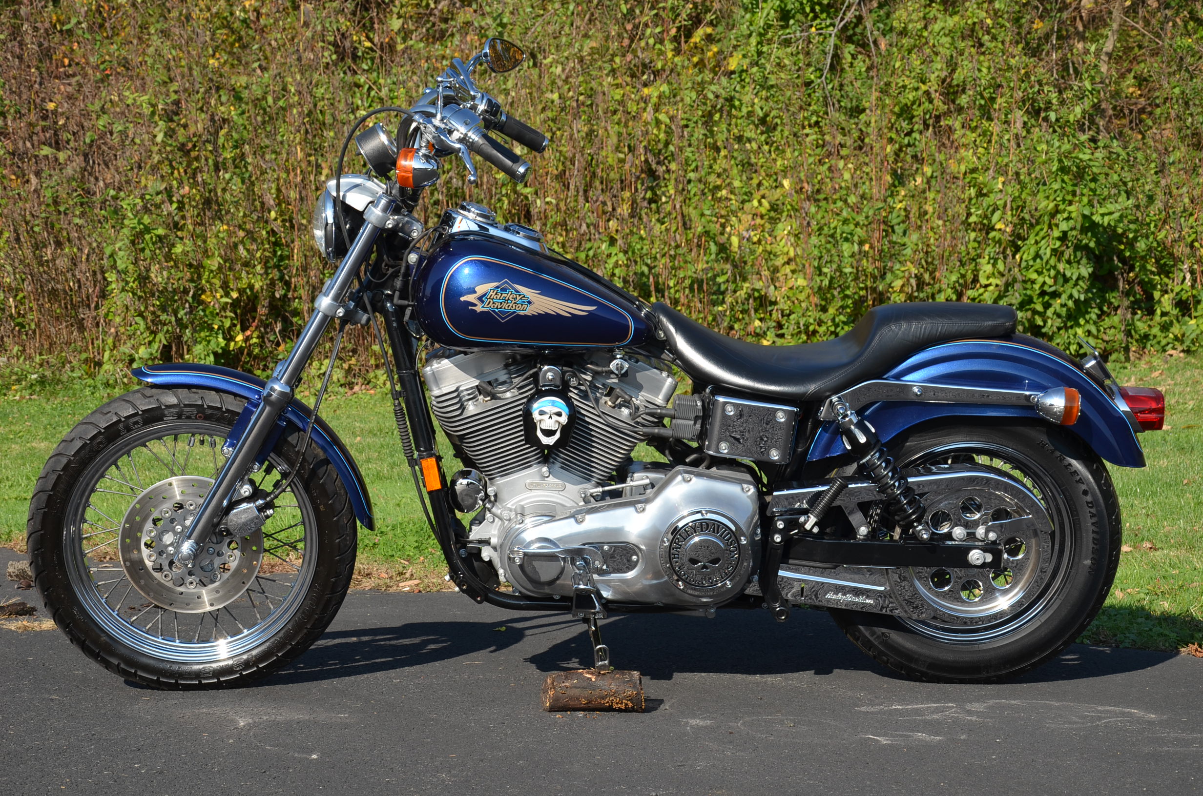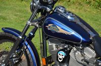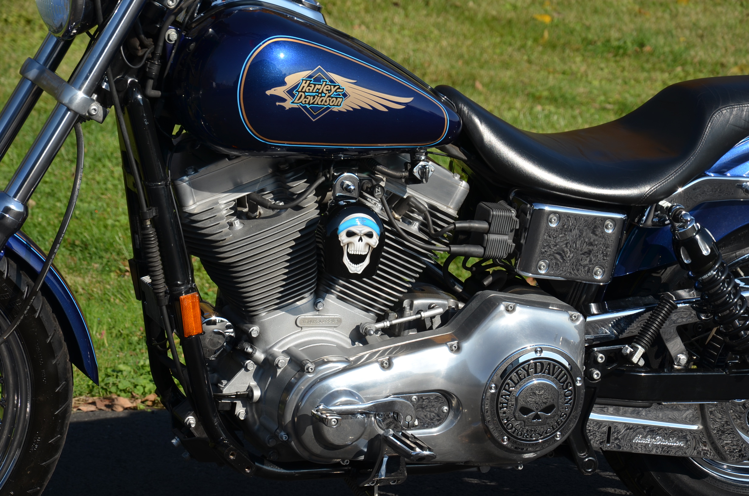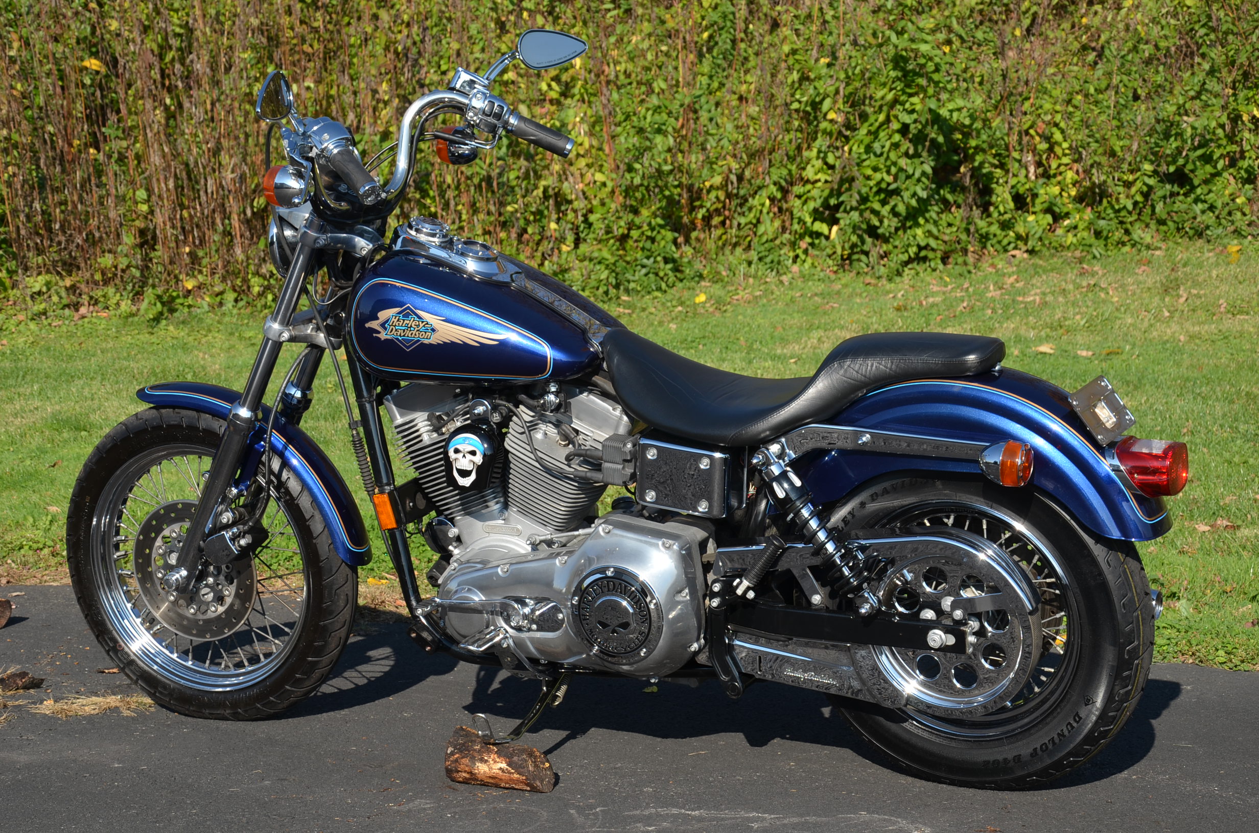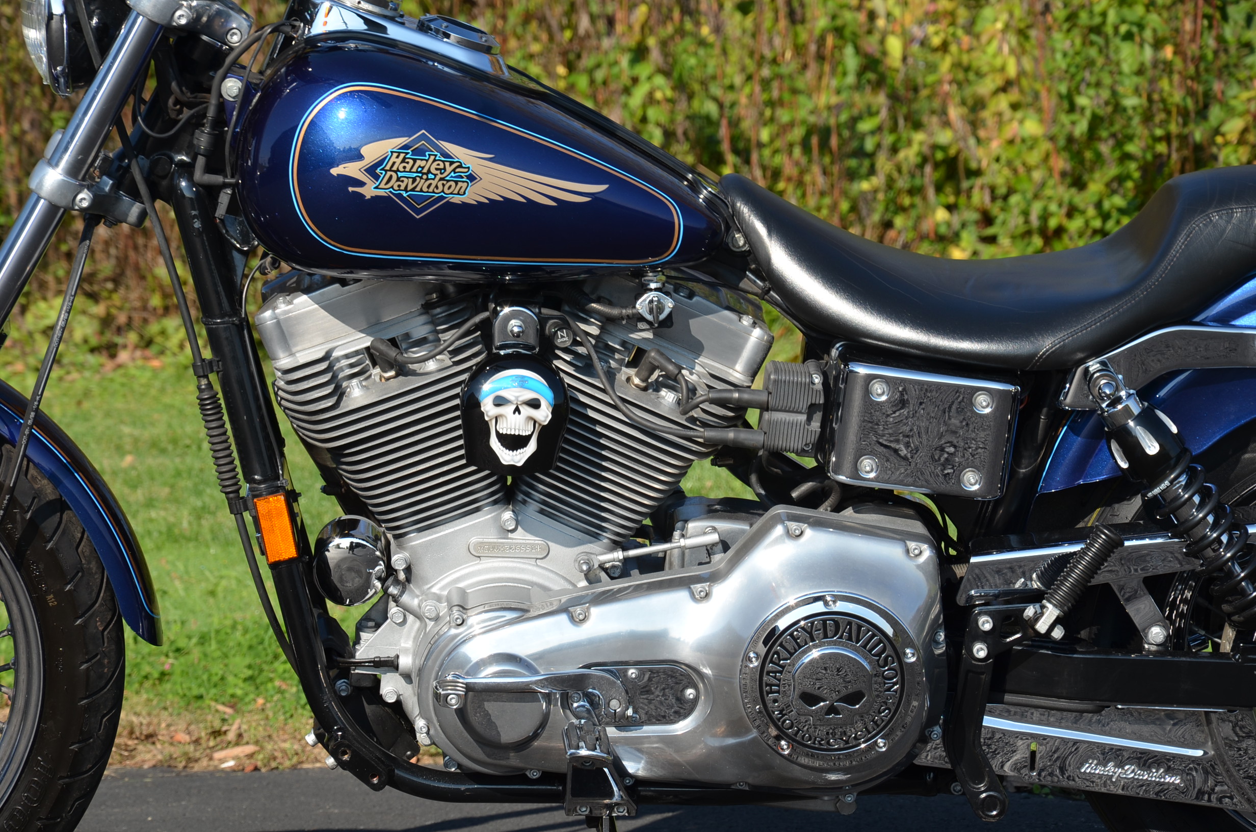 Sinister Blue metallic. 36,884 miles. 88” 1450cc Fuel injected Twin Cam motor. Screamin' Eagle stage 1 carb kit w/ high flow air cleaner, chrome carb top cover, chrome forks/sliders, chrome handlebar controls, chrome pegs, chrome shift peg, chrome skull teardrop mirrors, chrome battery cover, logo cam cover, anodized black billet shocks, chrome layback tag, factory spoke wheels, logo axle covers, black skull horn cover, skull derby cover, chrome dash, chrome caliper bracket & covers, floating rotors, badlander low profile seat, chrome belt guards, chrome pulley cover, rear turn signal relocation kit, & battery tender lead. Just serviced, fresh fluids, new rear tire, & detailed. Only $5,995