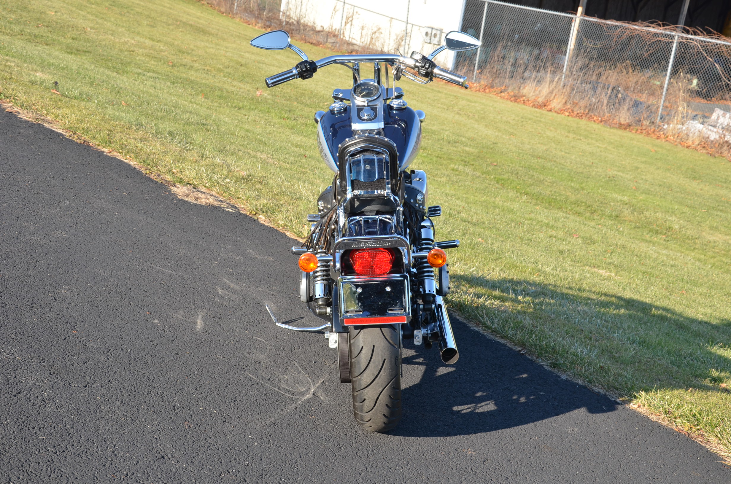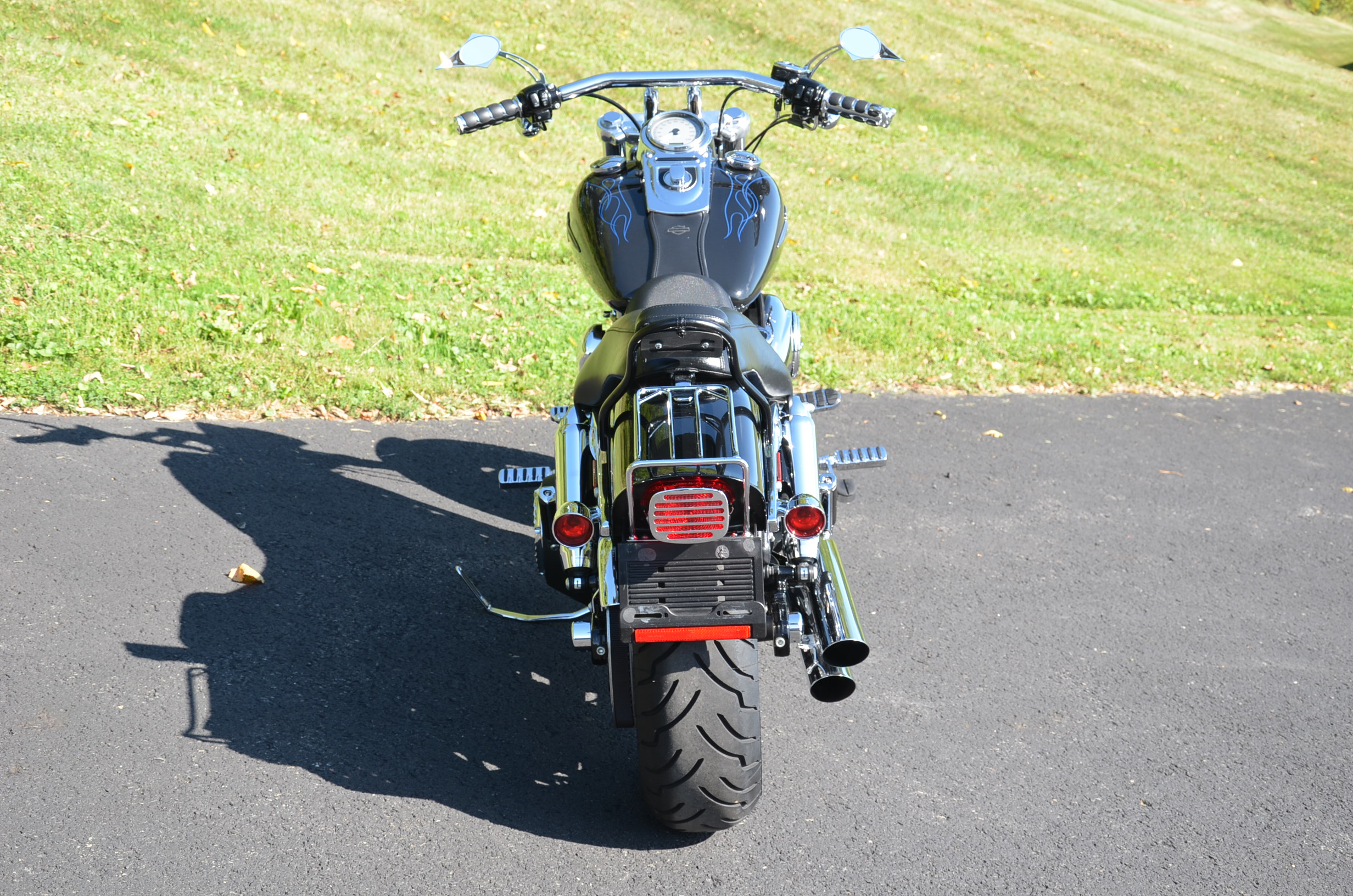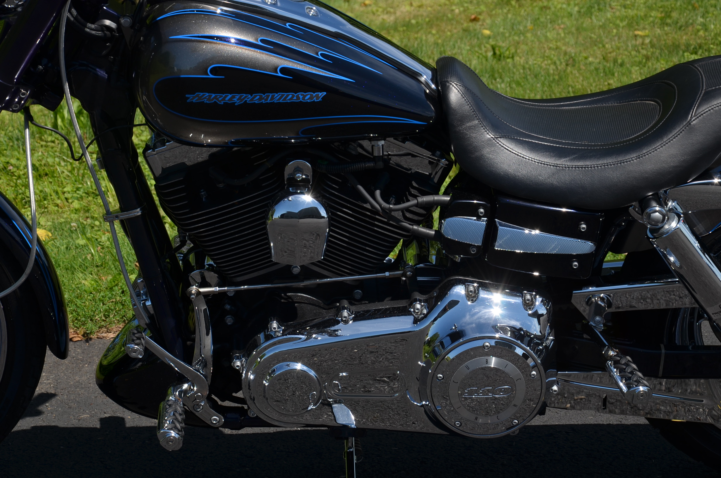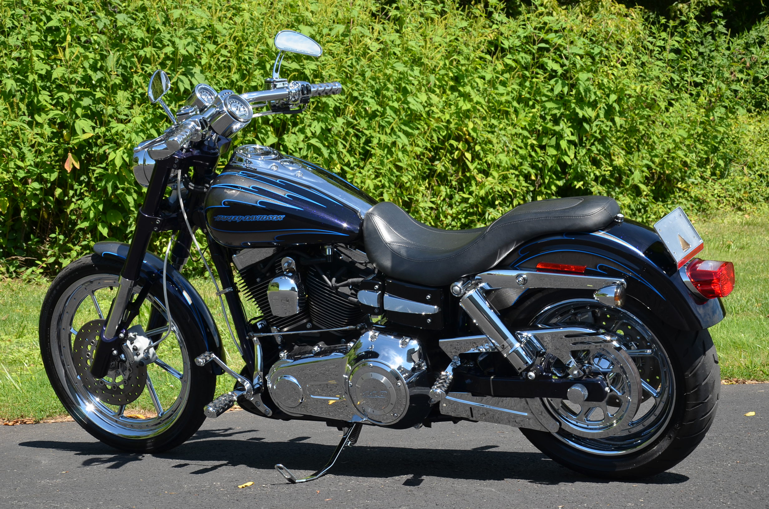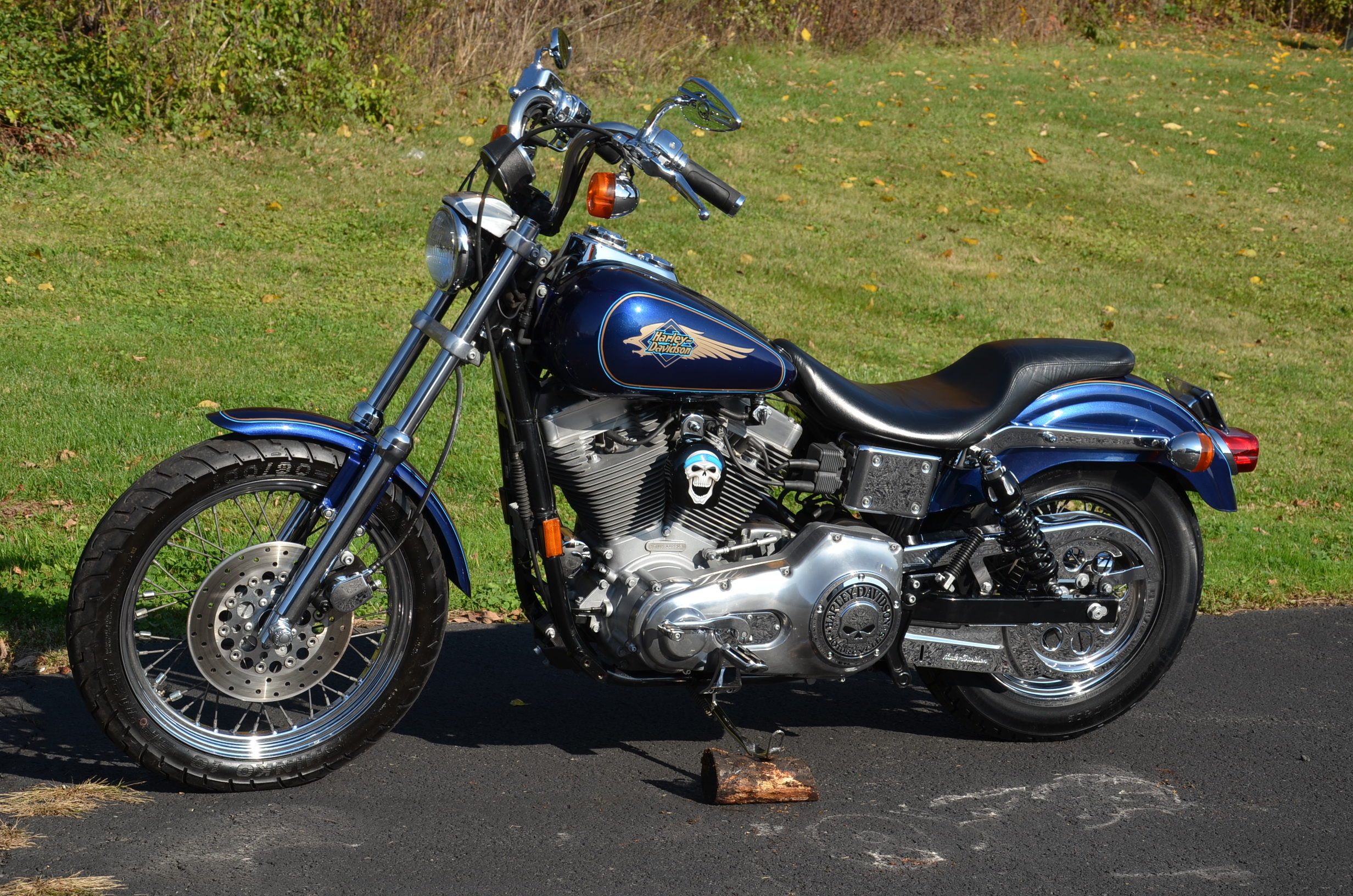 Sinister Blue metallic. 36,884 miles. 88” 1450cc Fuel injected Twin Cam motor. Screamin' Eagle stage 1 carb kit w/ high flow air cleaner, chrome carb top cover, chrome forks/sliders, chrome handlebar controls, chrome pegs, chrome shift peg, chrome skull teardrop mirrors, chrome battery cover, logo cam cover, anodized black billet shocks, chrome layback tag, factory spoke wheels, logo axle covers, black skull horn cover, skull derby cover, chrome dash, chrome caliper bracket & covers, floating rotors, badlander low profile seat, chrome belt guards, chrome pulley cover, rear turn signal relocation kit, & battery tender lead. Just serviced, fresh fluids, new rear tire, & detailed. Only $5,995