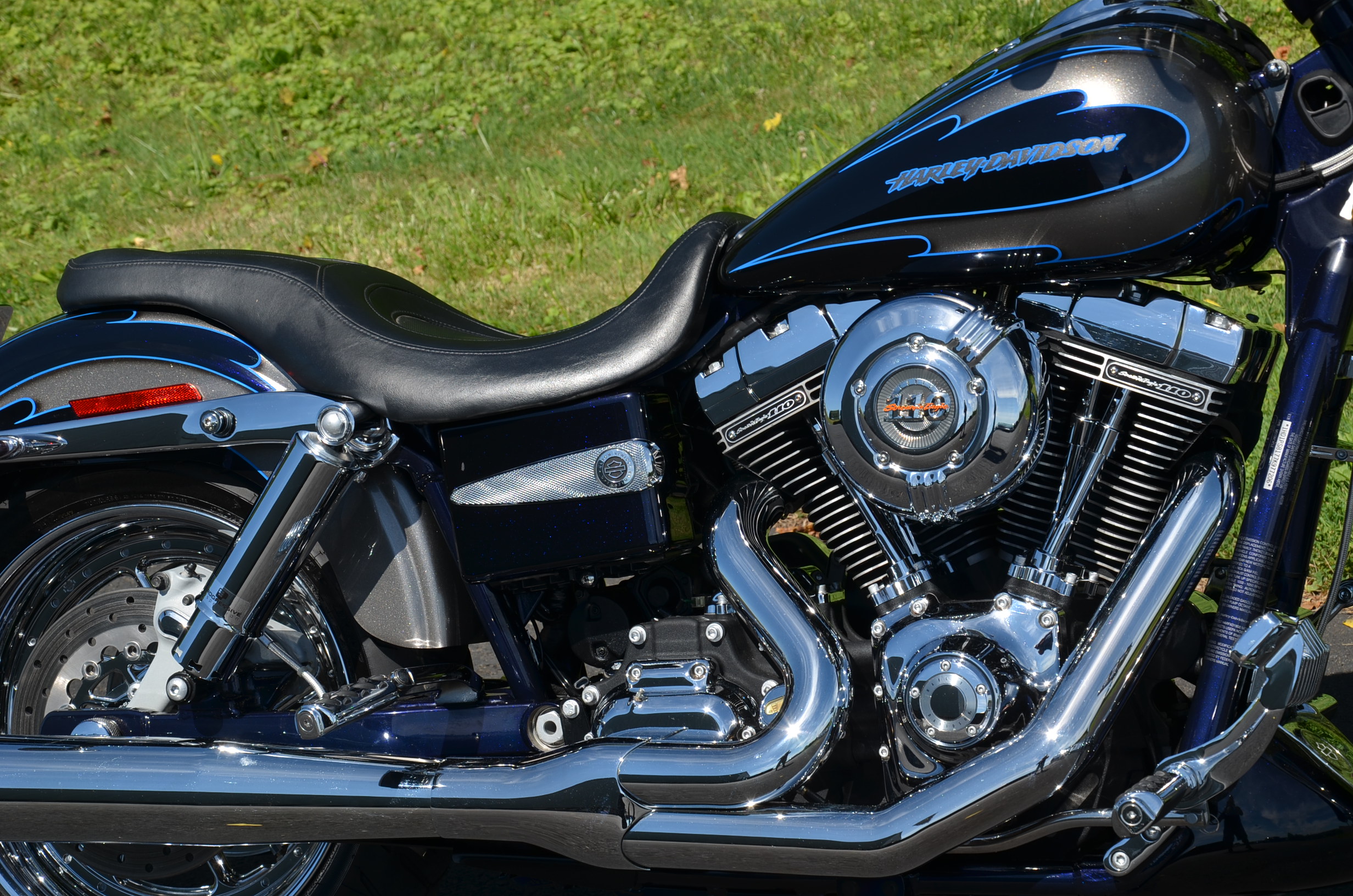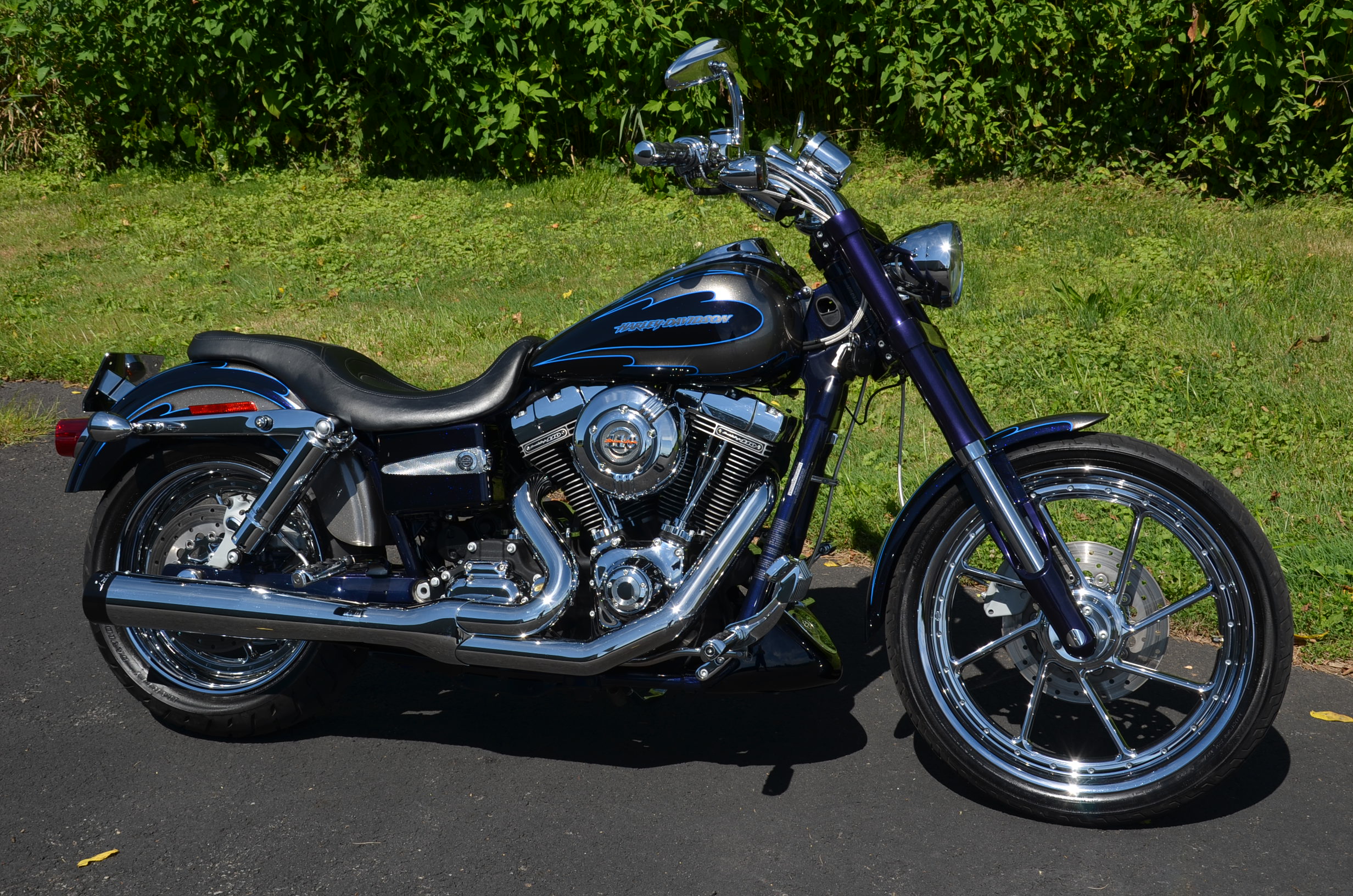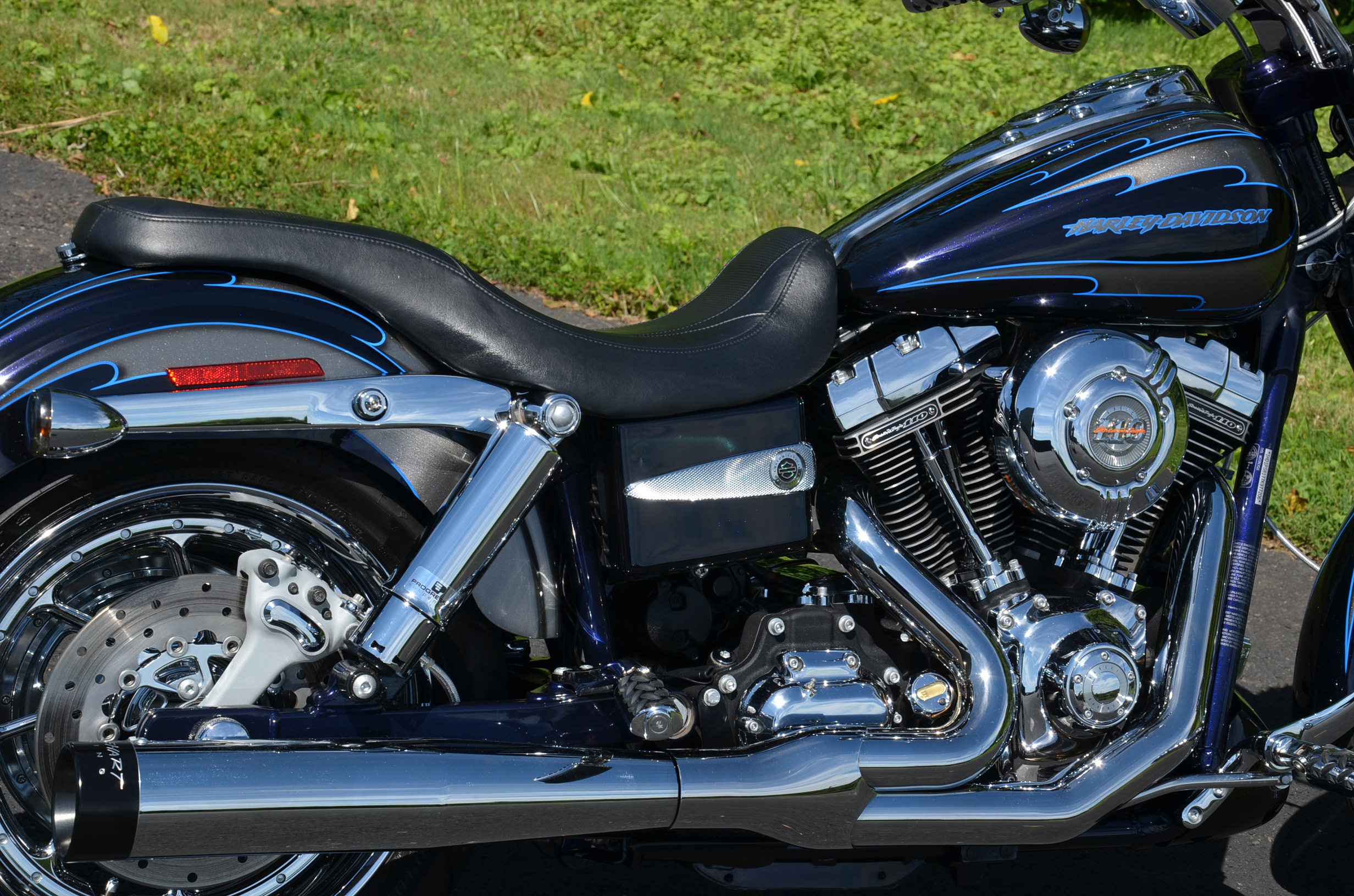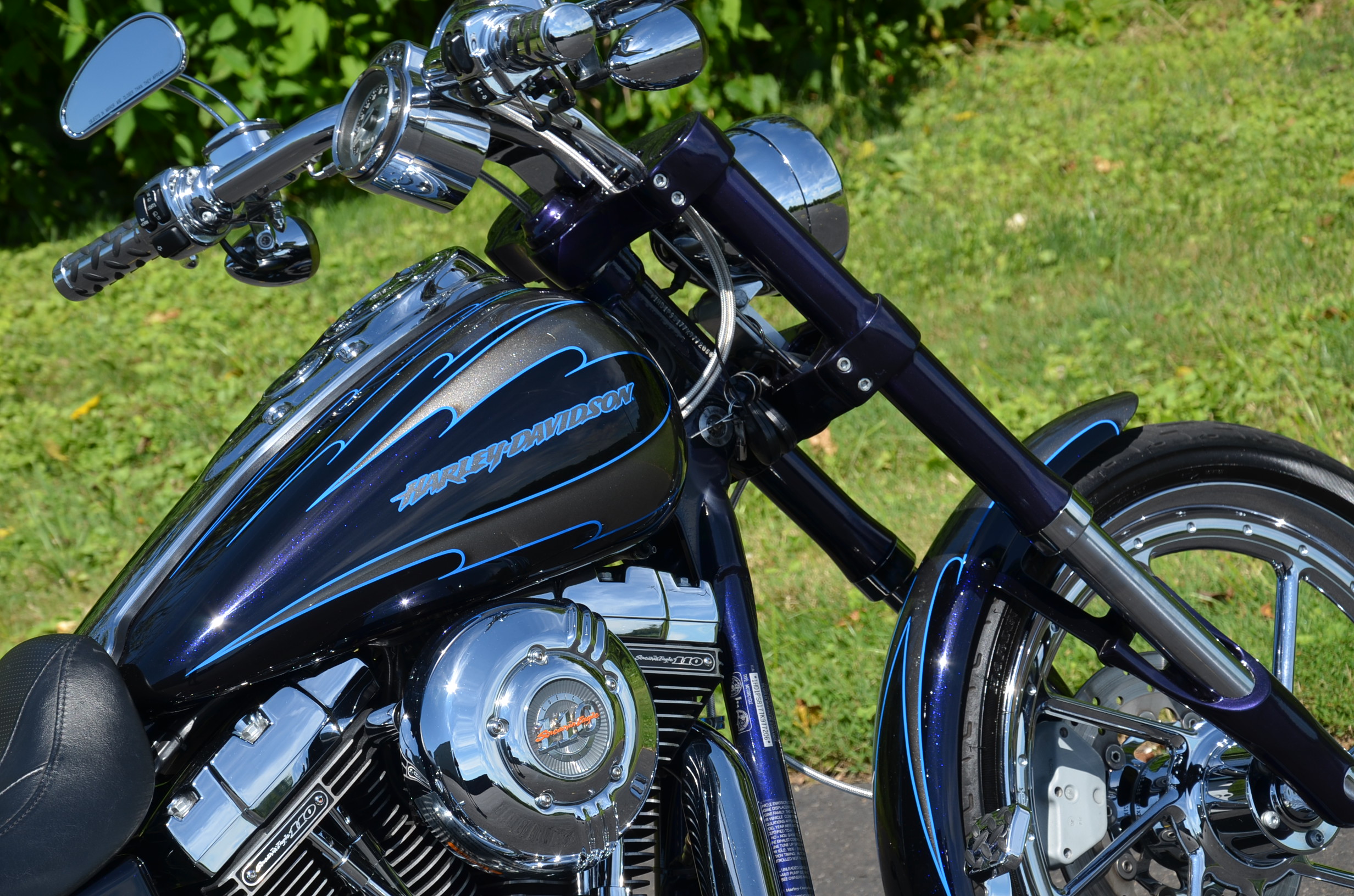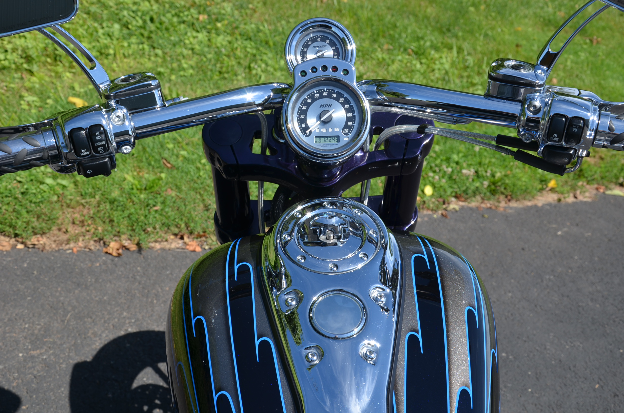 Sinister Blue metallic. 36,884 miles. 88” 1450cc Fuel injected Twin Cam motor. Screamin' Eagle stage 1 carb kit w/ high flow air cleaner, chrome carb top cover, chrome forks/sliders, chrome handlebar controls, chrome pegs, chrome shift peg, chrome skull teardrop mirrors, chrome battery cover, logo cam cover, anodized black billet shocks, chrome layback tag, factory spoke wheels, logo axle covers, black skull horn cover, skull derby cover, chrome dash, chrome caliper bracket & covers, floating rotors, badlander low profile seat, chrome belt guards, chrome pulley cover, rear turn signal relocation kit, & battery tender lead. Just serviced, fresh fluids, new rear tire, & detailed. Only $5,995