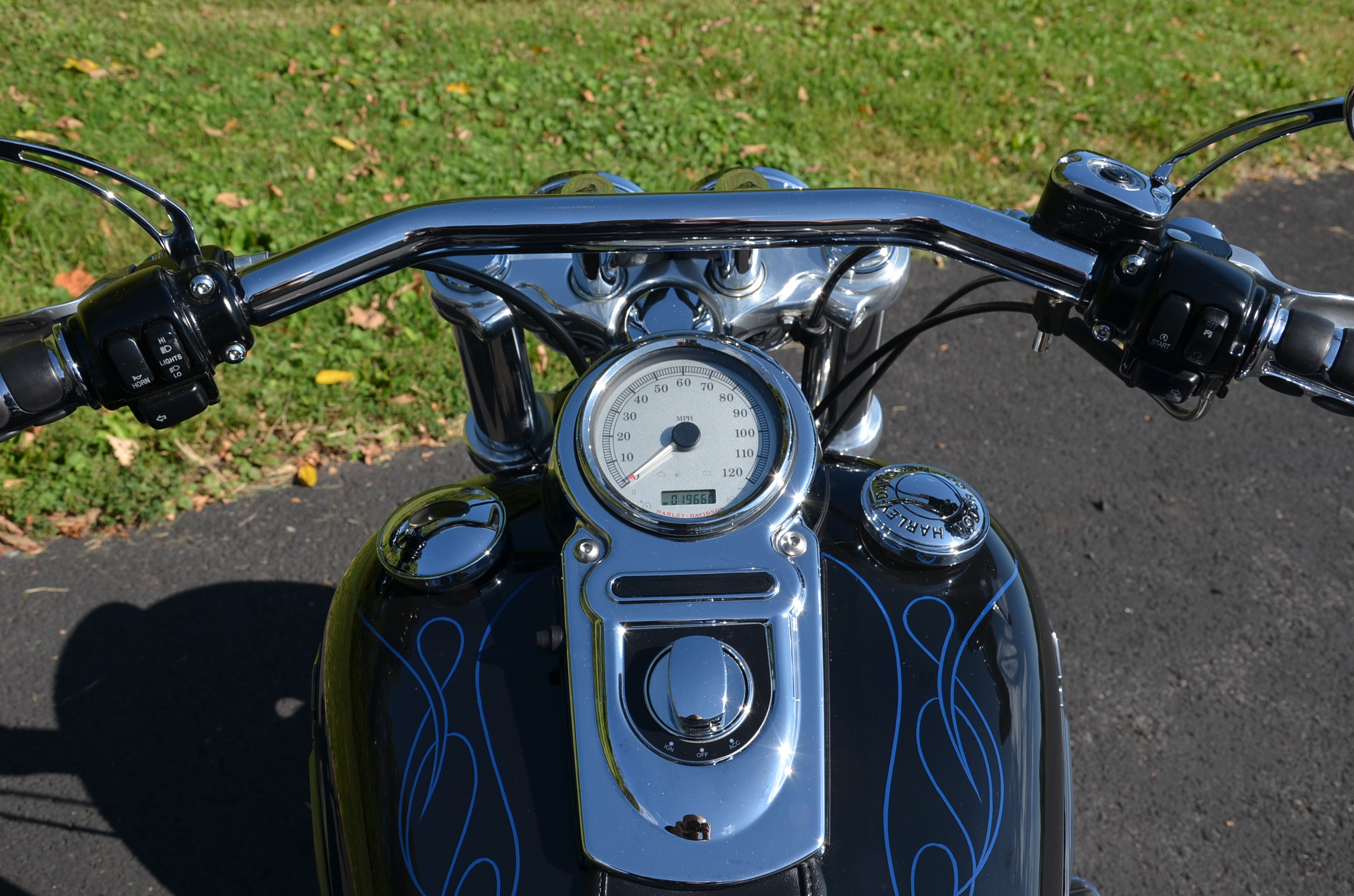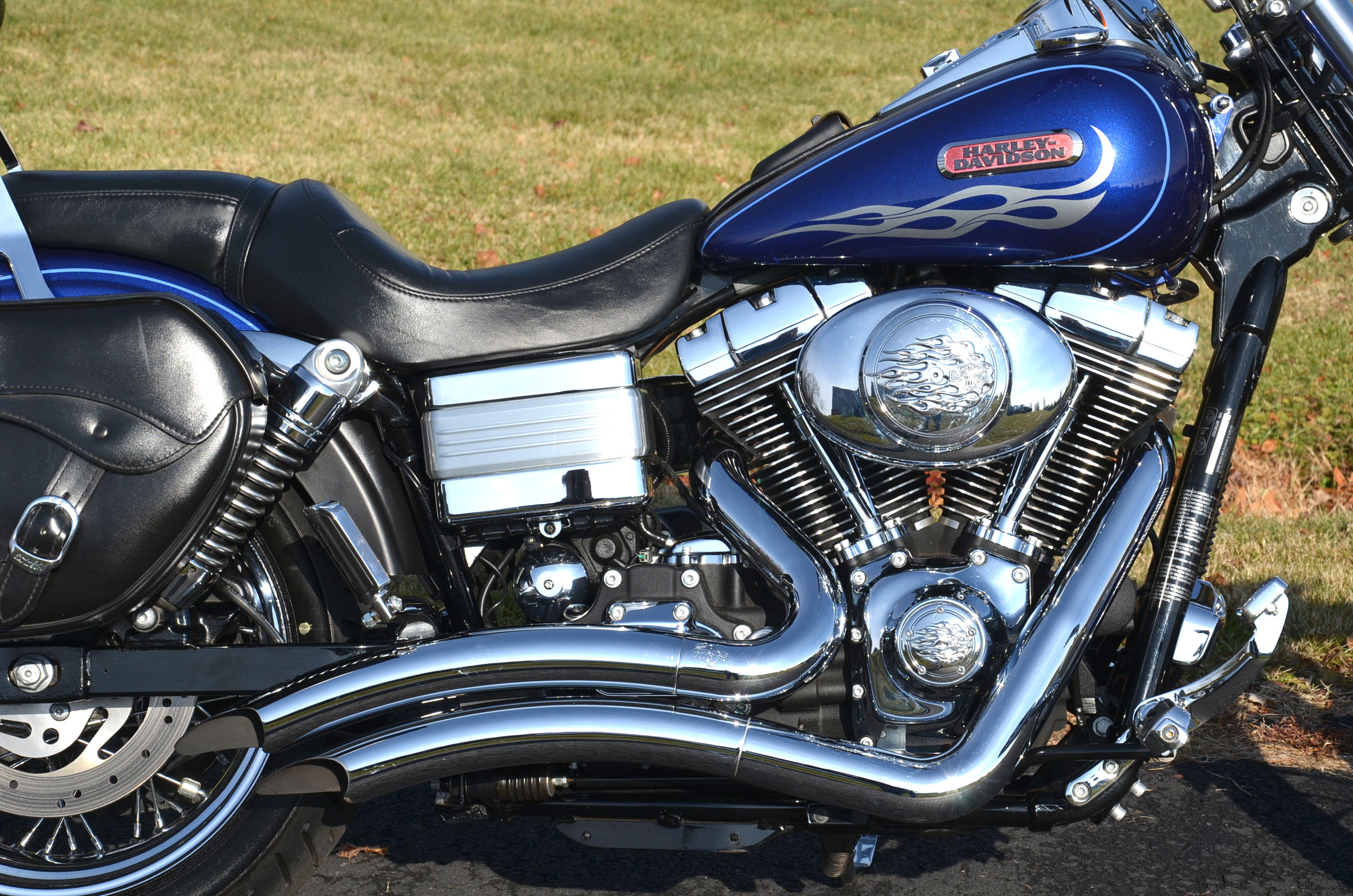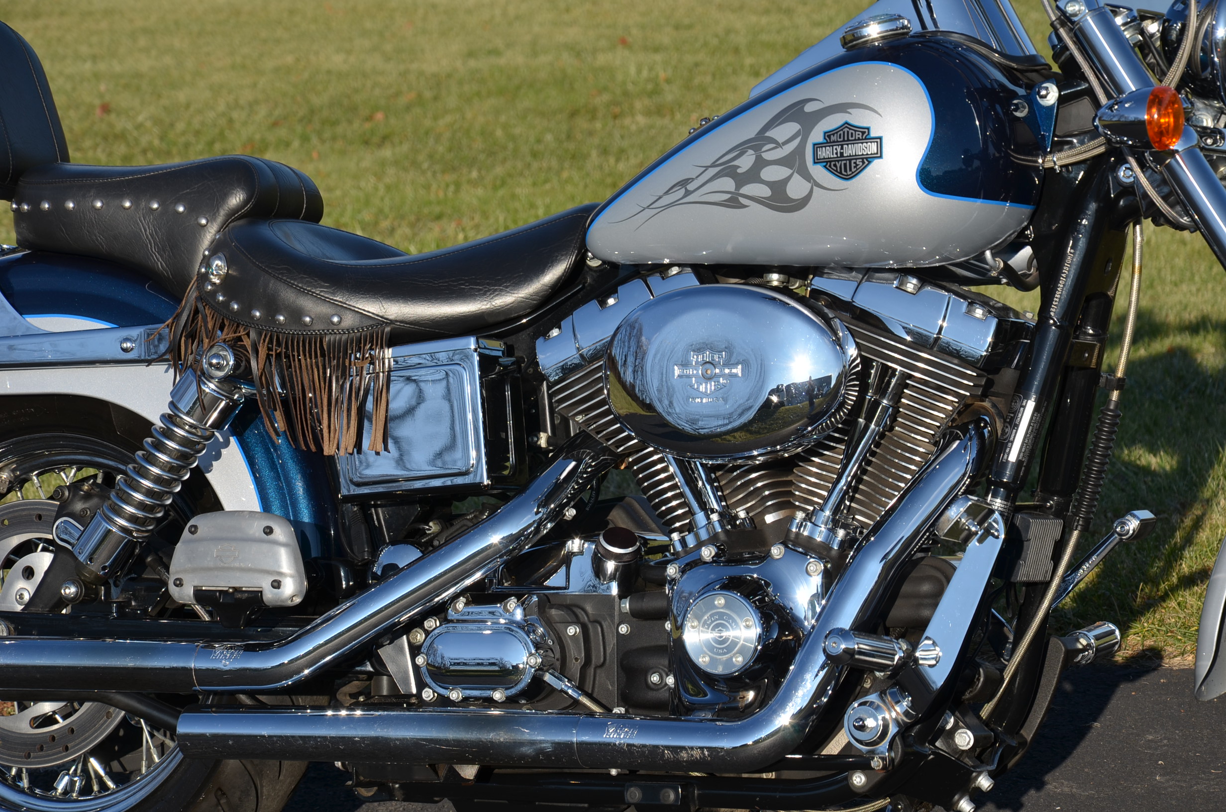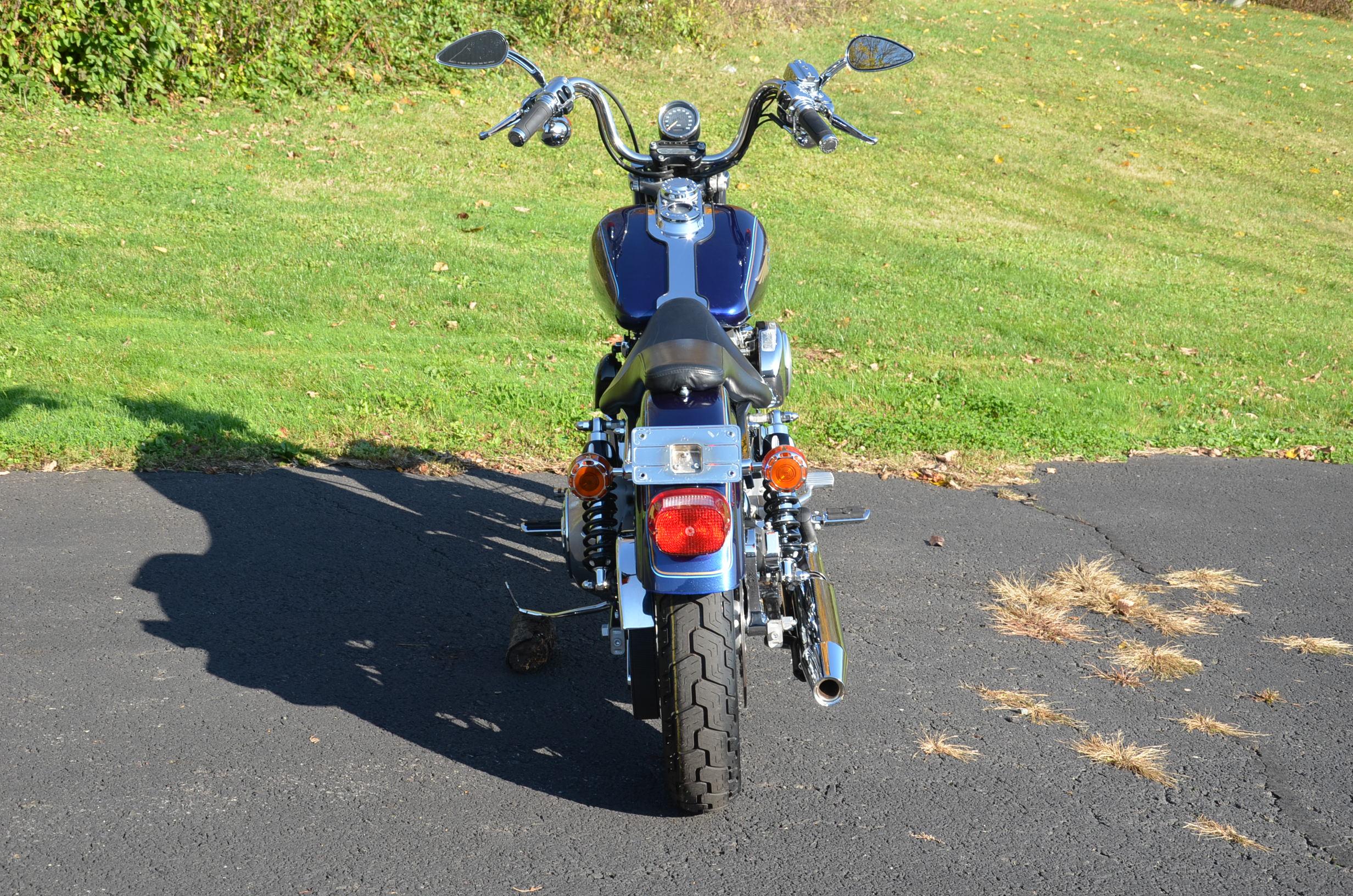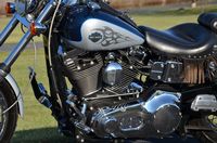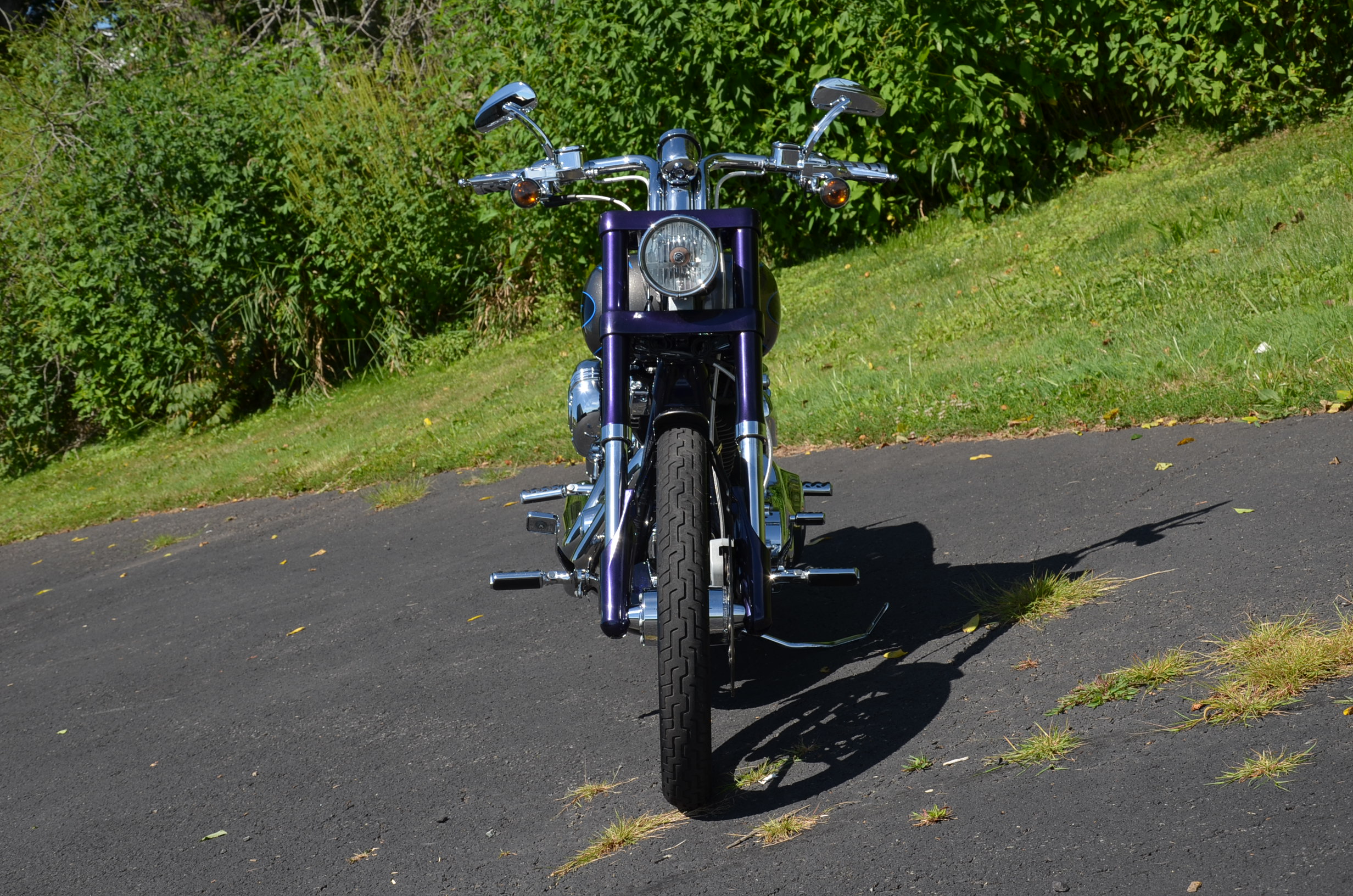 Sinister Blue metallic. 36,884 miles. 88” 1450cc Fuel injected Twin Cam motor. Screamin' Eagle stage 1 carb kit w/ high flow air cleaner, chrome carb top cover, chrome forks/sliders, chrome handlebar controls, chrome pegs, chrome shift peg, chrome skull teardrop mirrors, chrome battery cover, logo cam cover, anodized black billet shocks, chrome layback tag, factory spoke wheels, logo axle covers, black skull horn cover, skull derby cover, chrome dash, chrome caliper bracket & covers, floating rotors, badlander low profile seat, chrome belt guards, chrome pulley cover, rear turn signal relocation kit, & battery tender lead. Just serviced, fresh fluids, new rear tire, & detailed. Only $5,995