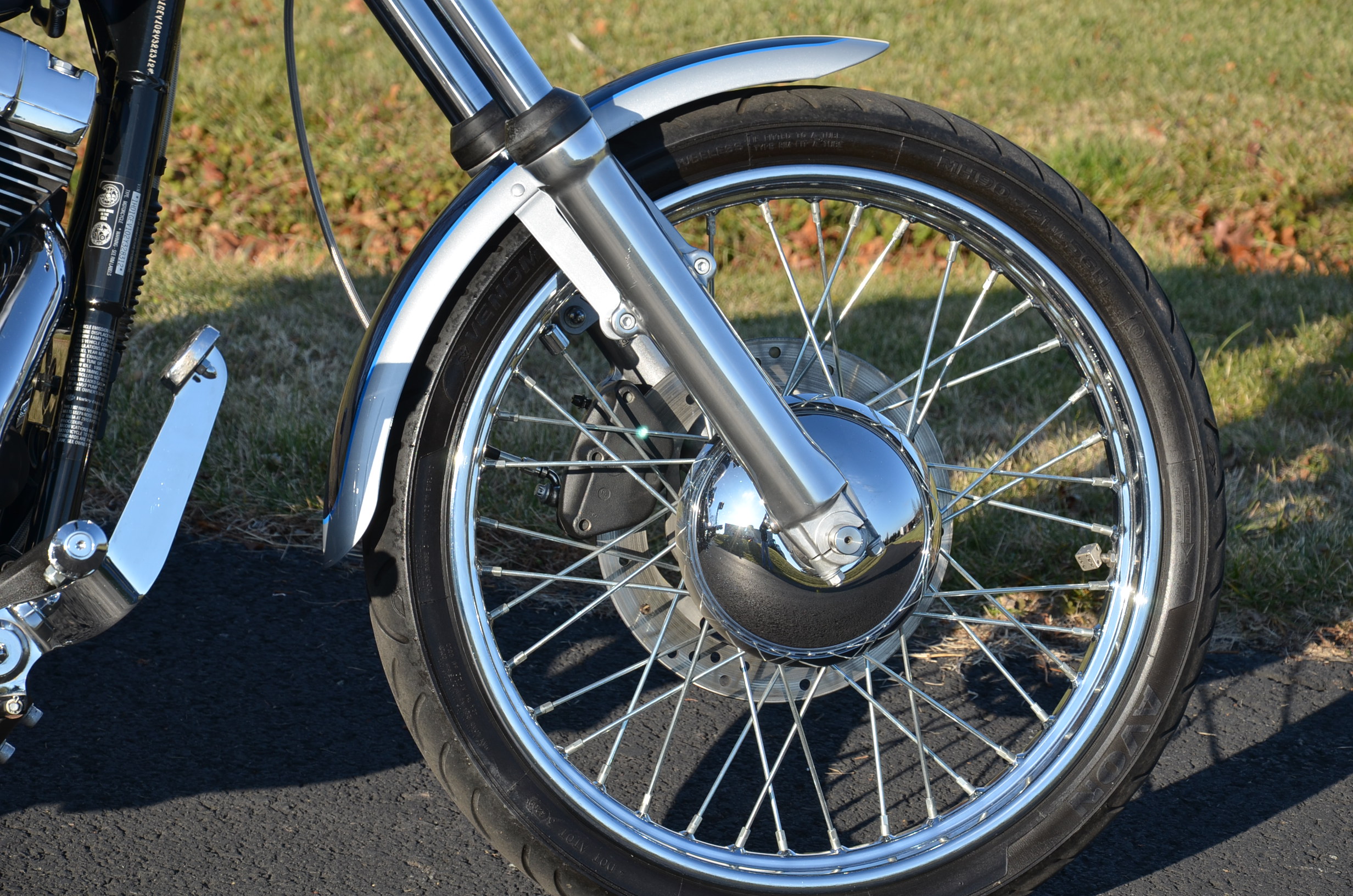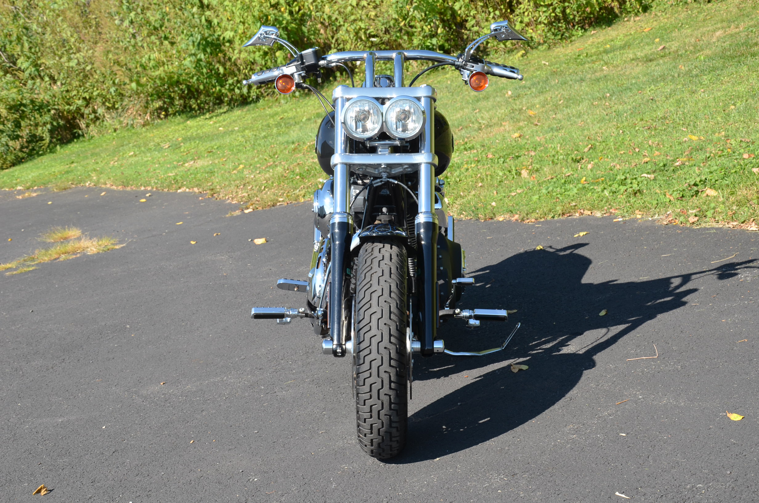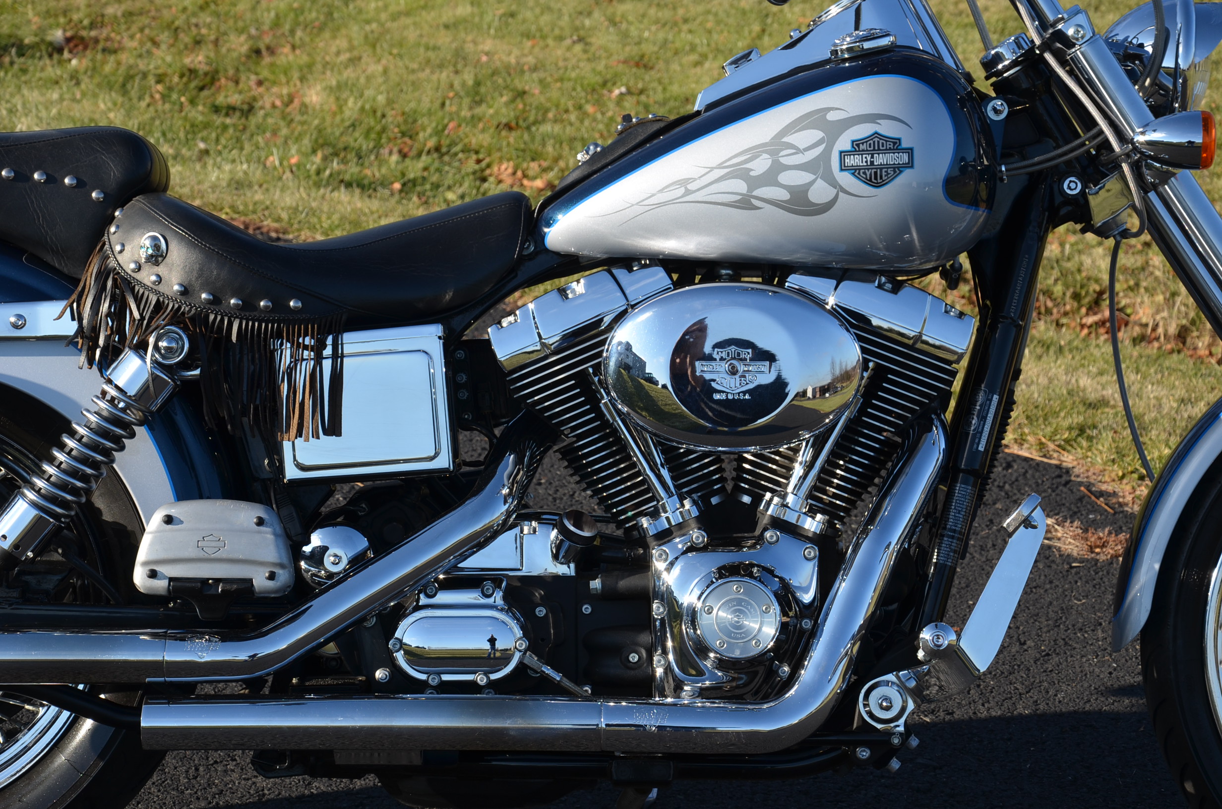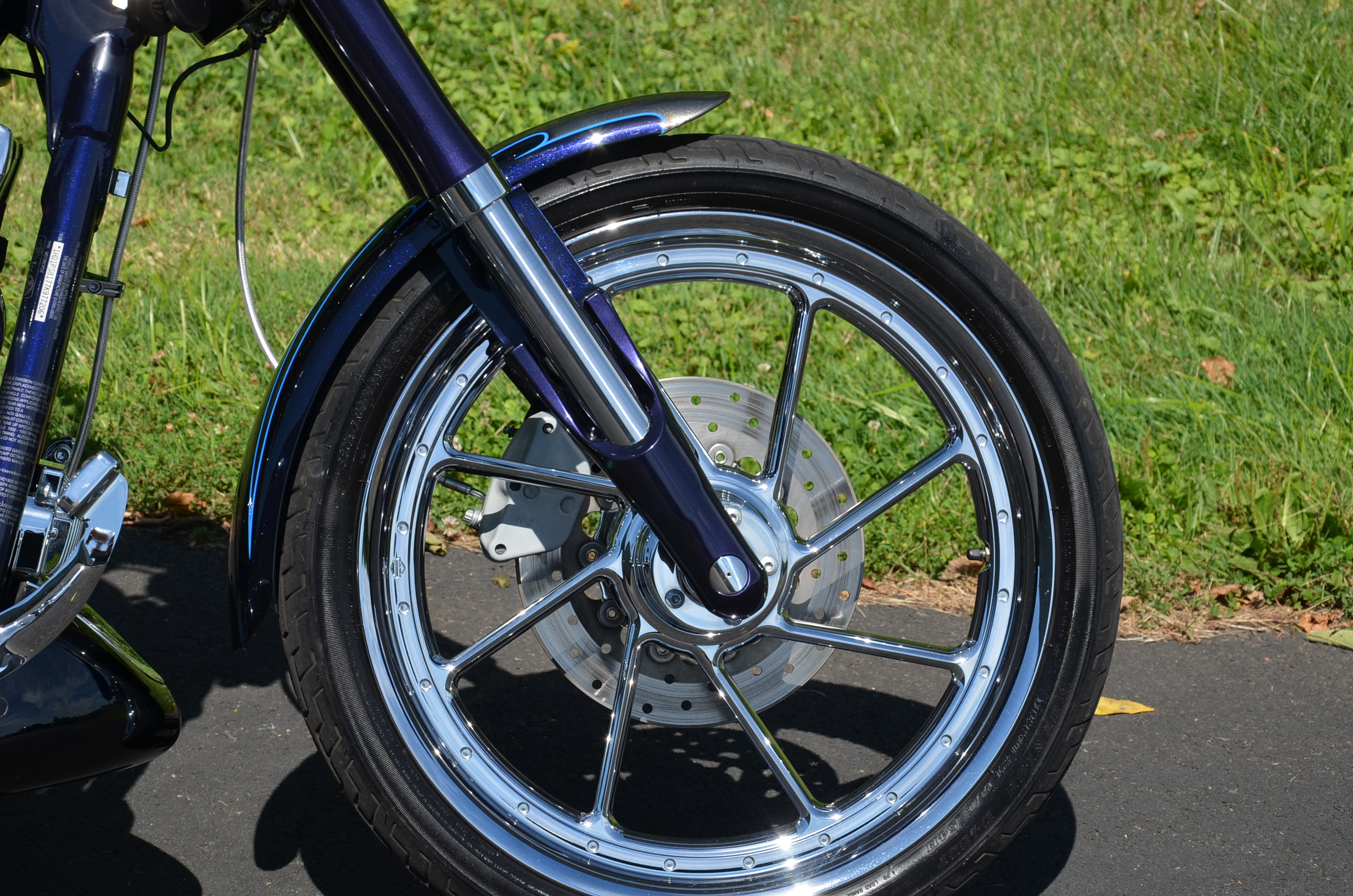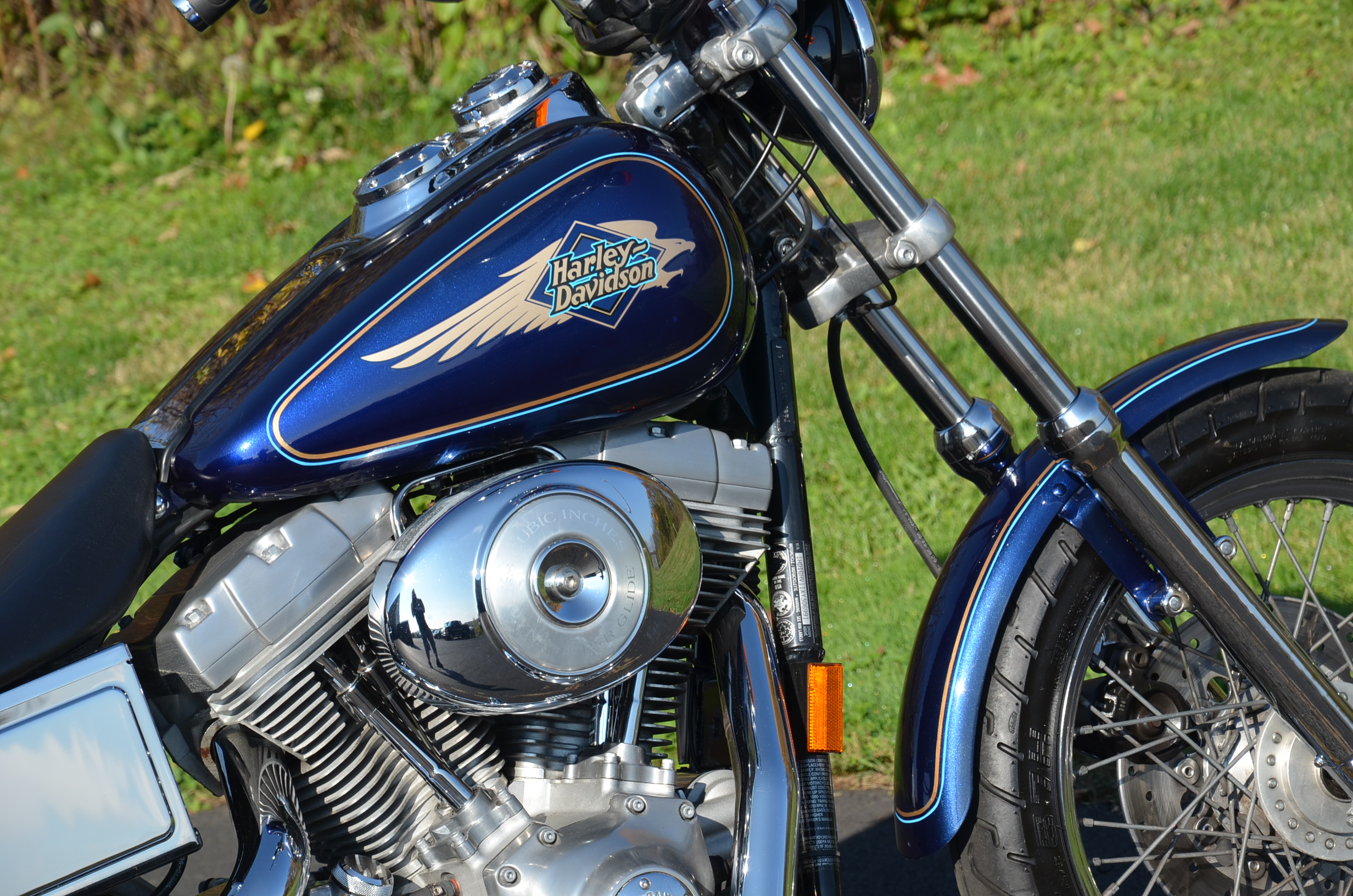 Sinister Blue metallic. 36,884 miles. 88” 1450cc Fuel injected Twin Cam motor. Screamin' Eagle stage 1 carb kit w/ high flow air cleaner, chrome carb top cover, chrome forks/sliders, chrome handlebar controls, chrome pegs, chrome shift peg, chrome skull teardrop mirrors, chrome battery cover, logo cam cover, anodized black billet shocks, chrome layback tag, factory spoke wheels, logo axle covers, black skull horn cover, skull derby cover, chrome dash, chrome caliper bracket & covers, floating rotors, badlander low profile seat, chrome belt guards, chrome pulley cover, rear turn signal relocation kit, & battery tender lead. Just serviced, fresh fluids, new rear tire, & detailed. Only $5,995