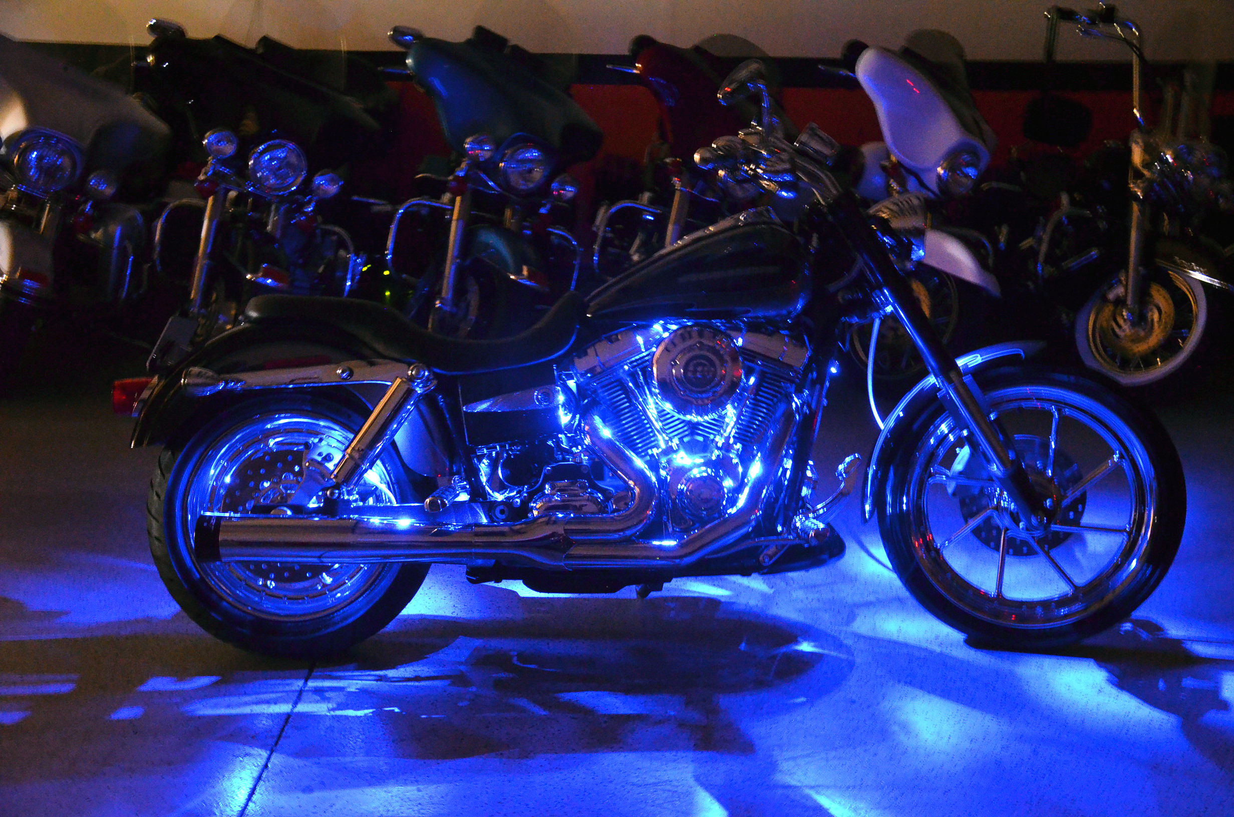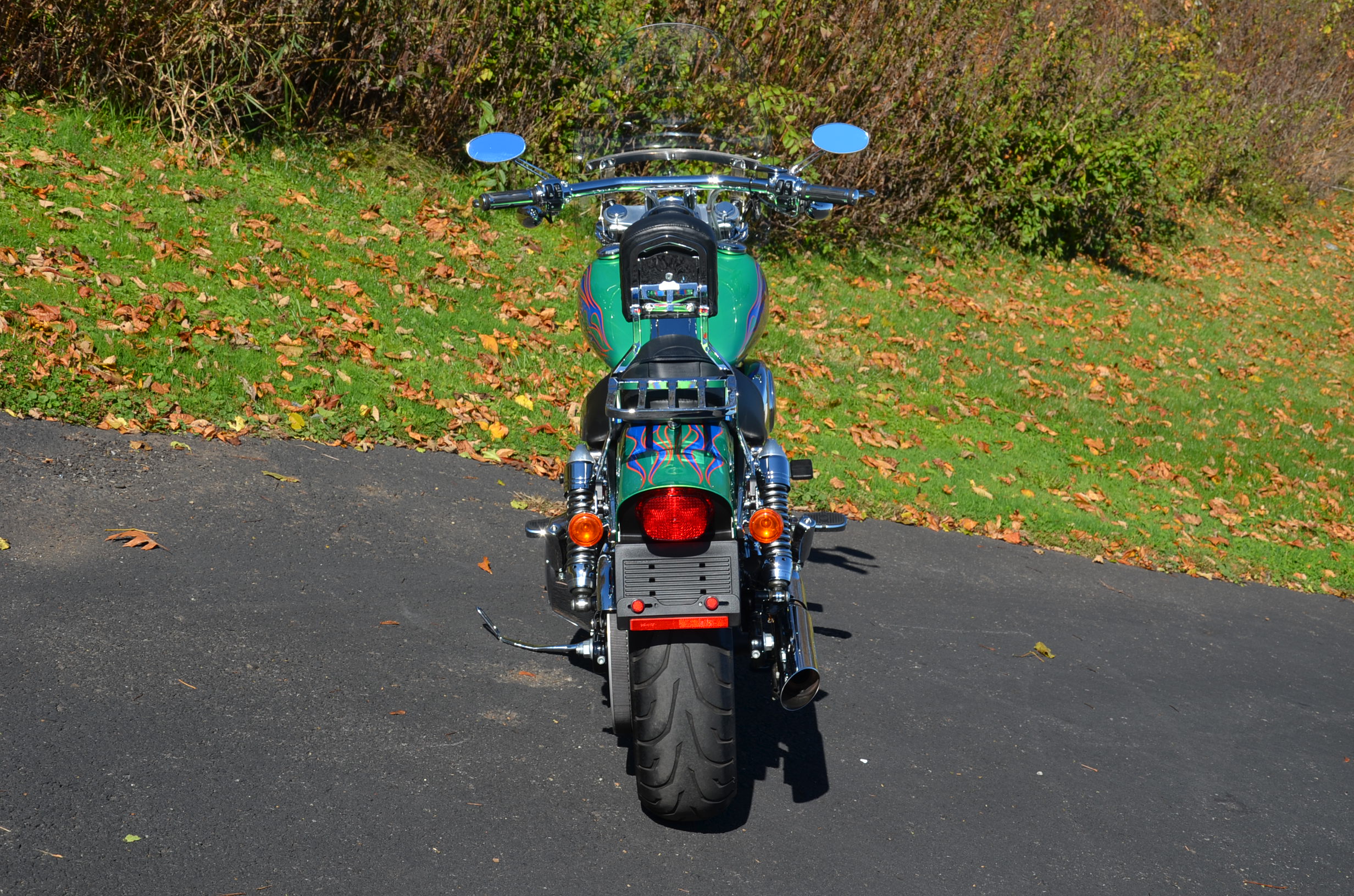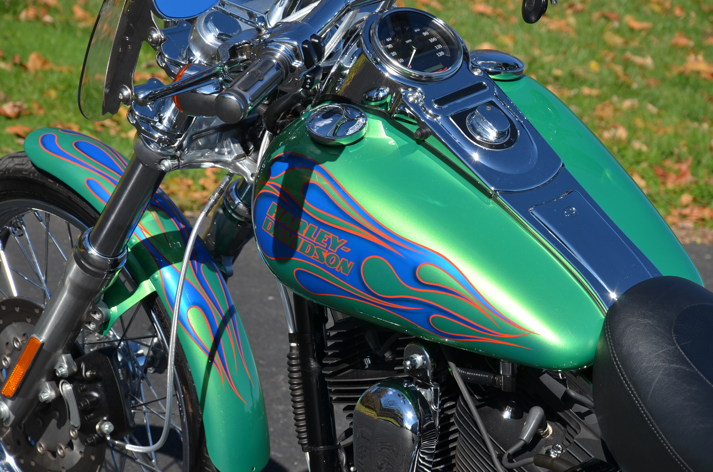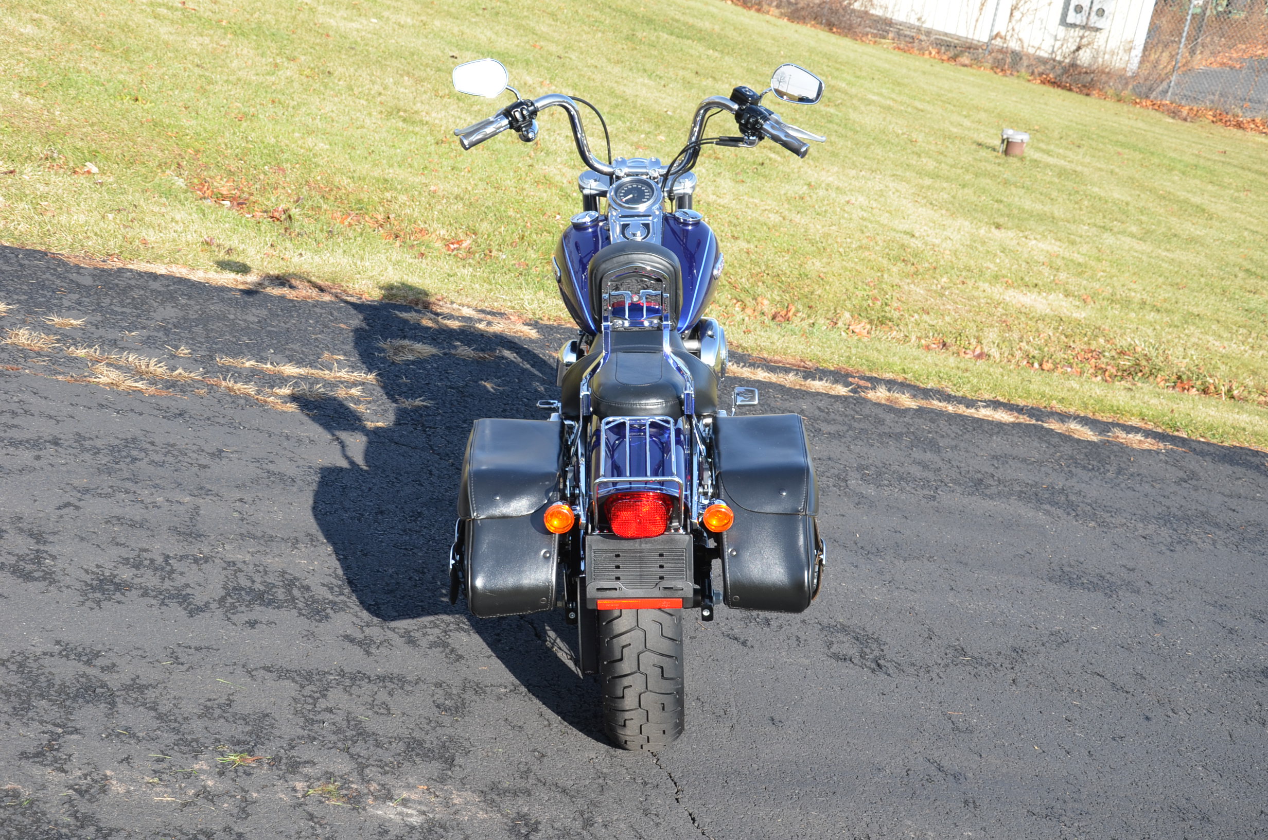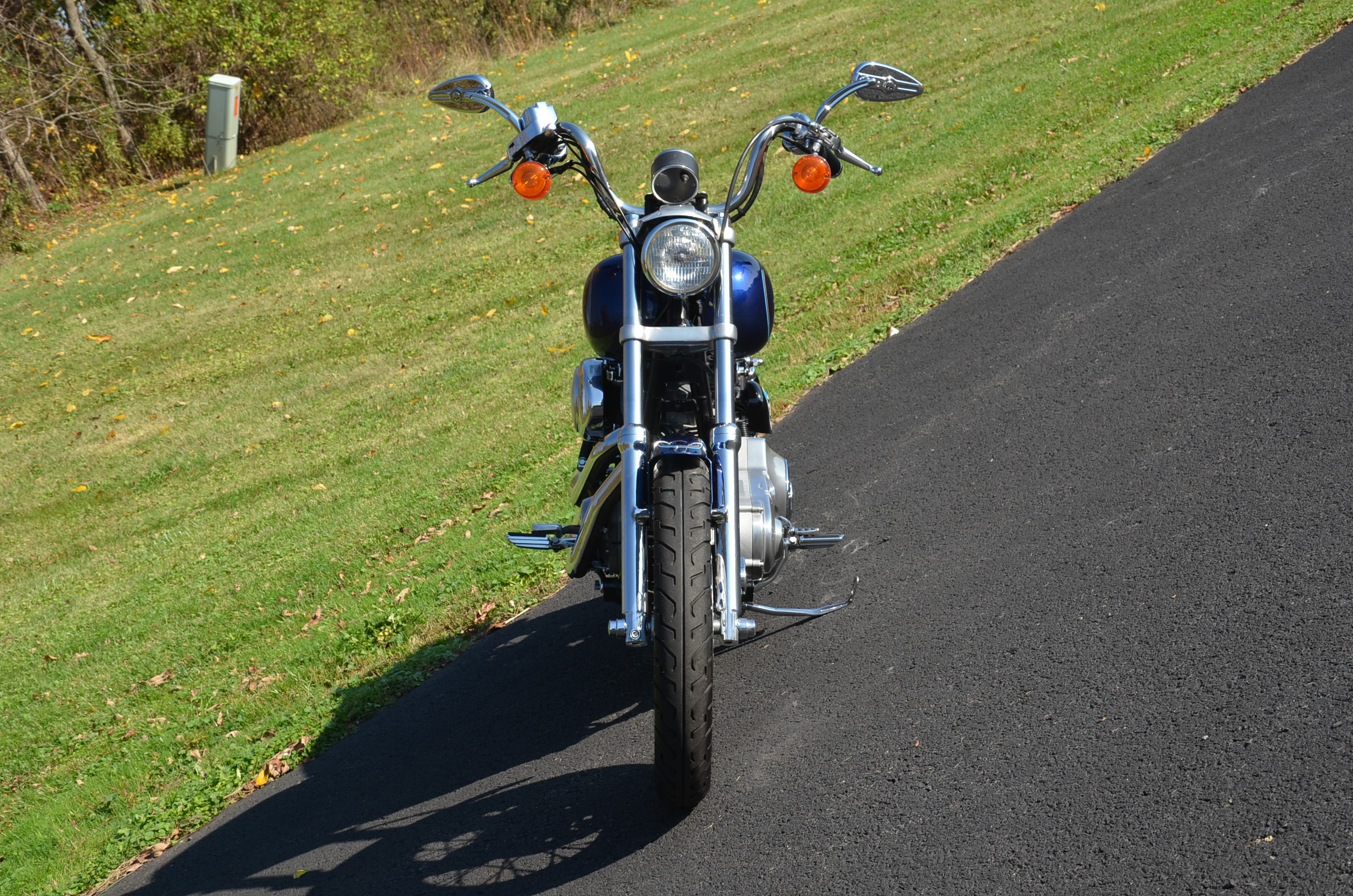 Sinister Blue metallic. 36,884 miles. 88” 1450cc Fuel injected Twin Cam motor. Screamin' Eagle stage 1 carb kit w/ high flow air cleaner, chrome carb top cover, chrome forks/sliders, chrome handlebar controls, chrome pegs, chrome shift peg, chrome skull teardrop mirrors, chrome battery cover, logo cam cover, anodized black billet shocks, chrome layback tag, factory spoke wheels, logo axle covers, black skull horn cover, skull derby cover, chrome dash, chrome caliper bracket & covers, floating rotors, badlander low profile seat, chrome belt guards, chrome pulley cover, rear turn signal relocation kit, & battery tender lead. Just serviced, fresh fluids, new rear tire, & detailed. Only $5,995