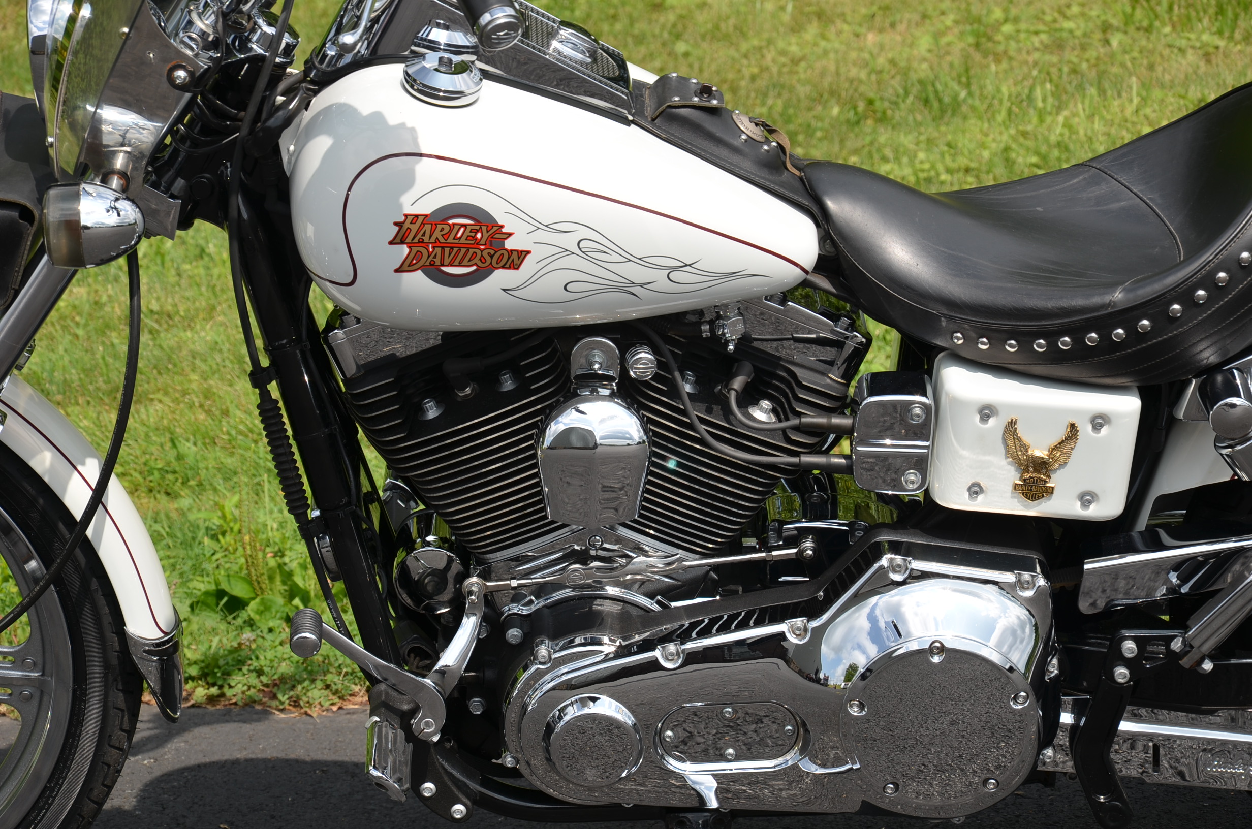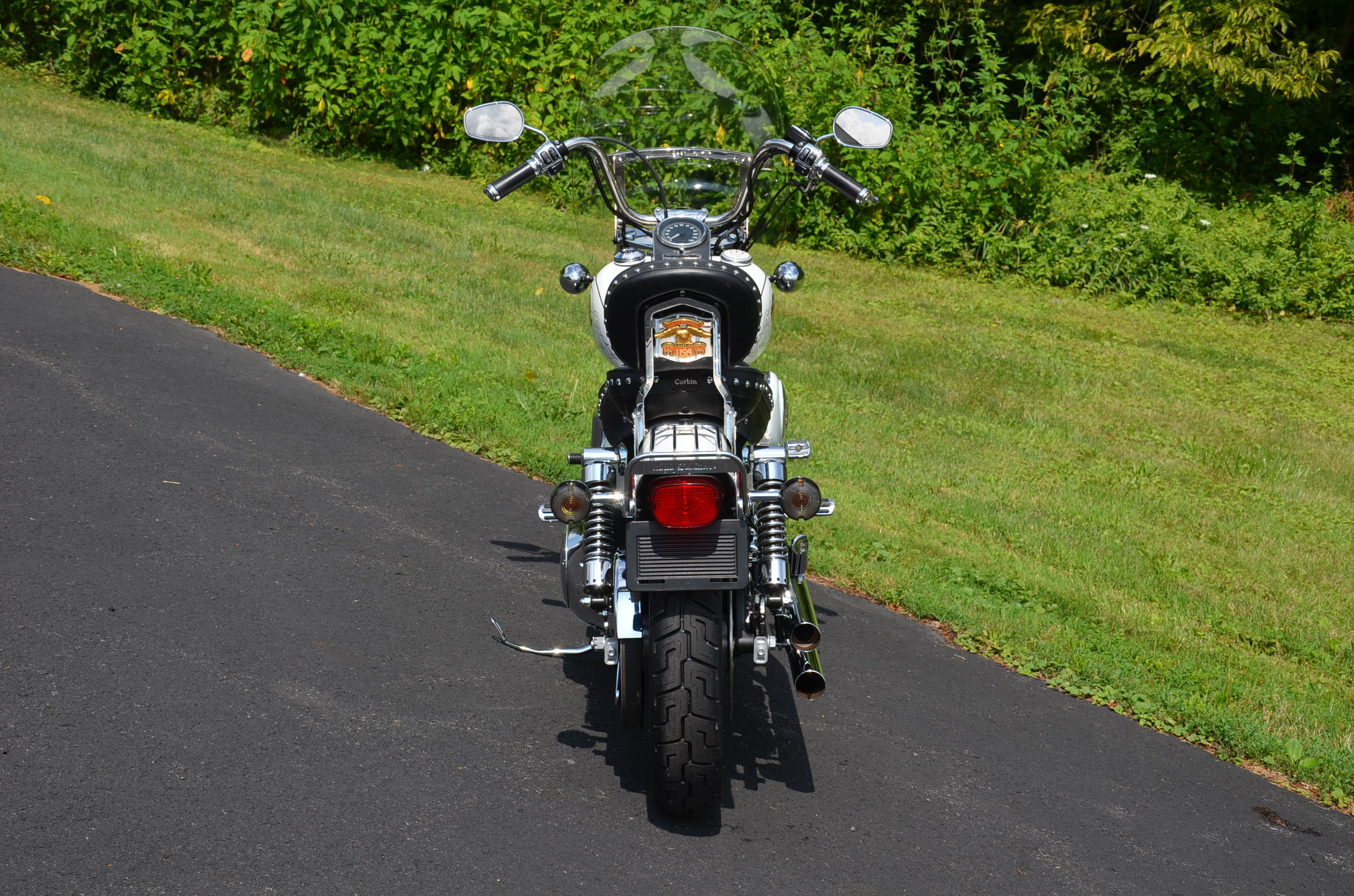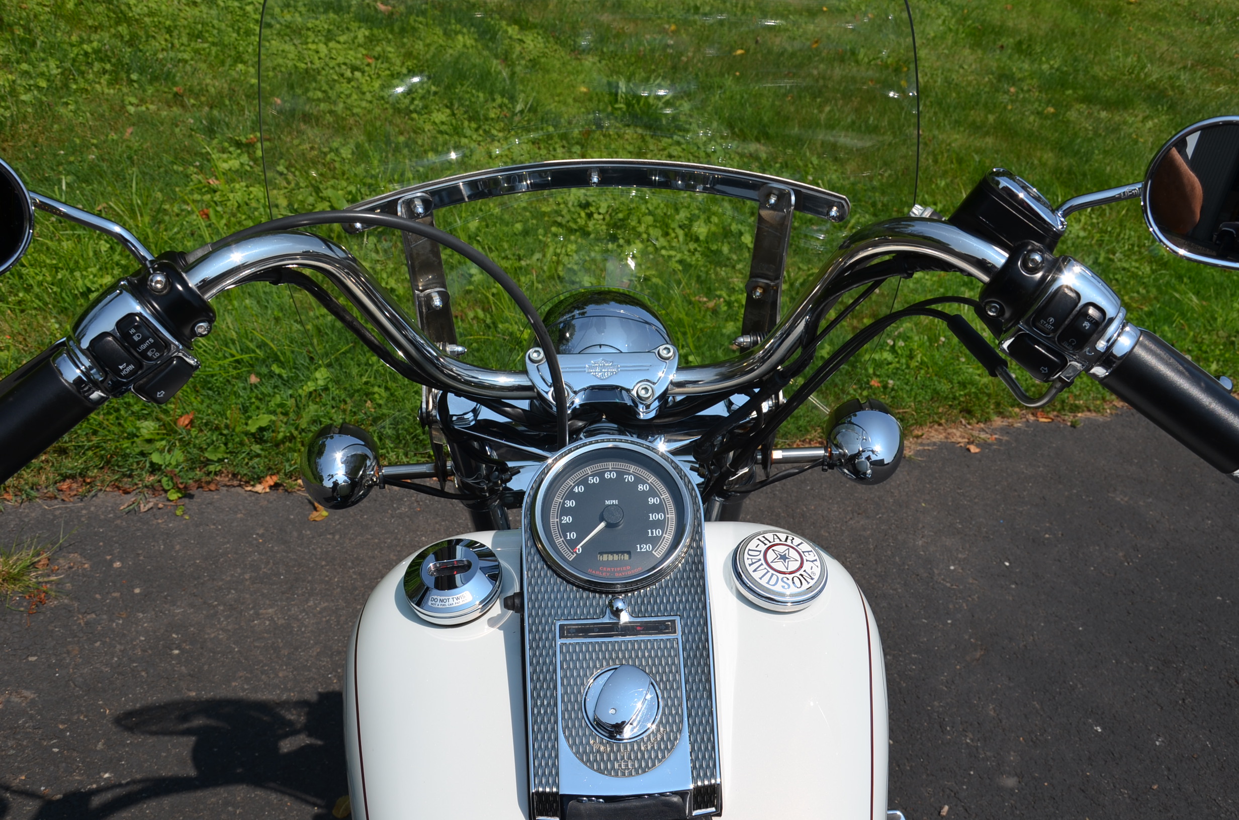 Local bike. Pearl White. Only 17,707 miles. Thousands in extras including Screamin Eagle Stage 1 carb kit w/ high flow air cleaner, new LA Choppers staggered exhaust w/ heatshields, Screamin Eagle' chrome fork brace, chrome lower legs/fork sliders, floating rotor, chrome HD lightning front wheel, solid rear wheel, chrome boot covers, Corbin leather studded touring seat w/ matching sissy bar pad, quick detachable windshield, studded leather tank pouch, dash trim, leather grips, chrome belt guards, turn signal relocation front & rear w/ smoked lenses, logo gas cap, color matched air cleaner cover, battery cover, & module cover, chrome switch housings, chrome front & rear pegs, chrome brake pedal, chrome luggage rack, hot toppers, shock bolt covers, chrome caliper inserts, chrome voltage regulator cover, leather fork bag, headlight bezel, chrome flame shift rod, chrome choke knob, chrome motor base cover, chrome oil line covers, battery tender lead, flame series air cleaner insert, cam cover, trans cover, & tons of factory chrome. Very well kept. Brand new Dunlop tires, serviced, fresh fluids, & detailed. Only $7,995