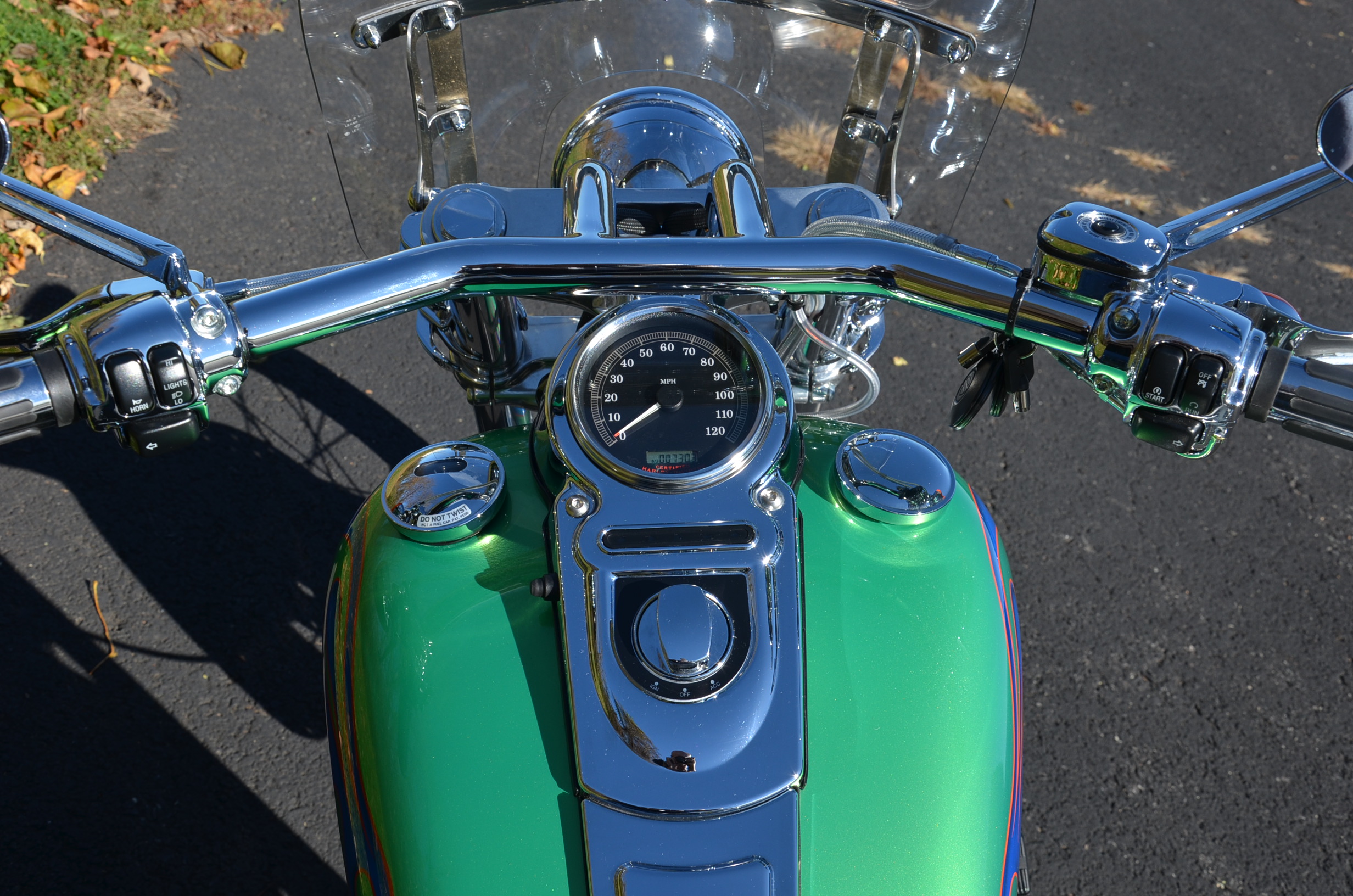 One owner local bike with only 7,304 miles. HD color shop limited edition #81/150 produced. 6-speed transmission & fuel injected 88” motor. The 2006’s have the beefier 49mm forks raked out to 36 degrees. Extras include factory security system with 2 fobs & 2 keys, Screamin’ Eagle 180 wide tire kit, Screamin’ Eagle II staggered exhaust pipes, Screamin’ Eagle Stage 1 high flow air cleaner, tuned, chrome handlebar controls including chrome switch housings, chrome levers, chrome HD slammer 1 1.4” fat drag bars with internal wiring, chrome steel braided cables & brake line, chrome front and rear pegs, quick detachable windshield, quick detachable sissy bar, chrome luggage rack, chrome grips, chrome belt guard, custom mirrors, chrome levers, chrome dash, floating rotor, and tons of factory chrome. This bike is super clean. Fully serviced, fresh fluids, & detailed. Only $10,495