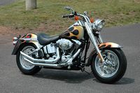 2003 100th ANNIVERSARY HARLEY FATBOY FLSTF S/E II mufflers. 1.25" fat drag bars, flame series mirrors, derby cover, chrome flame floorboards, flame shift rod, grips, chrome passenger pegs, & tons of factory chrome. 19,742 miles. Only $11,499. SORRY, IT'S SOLD |